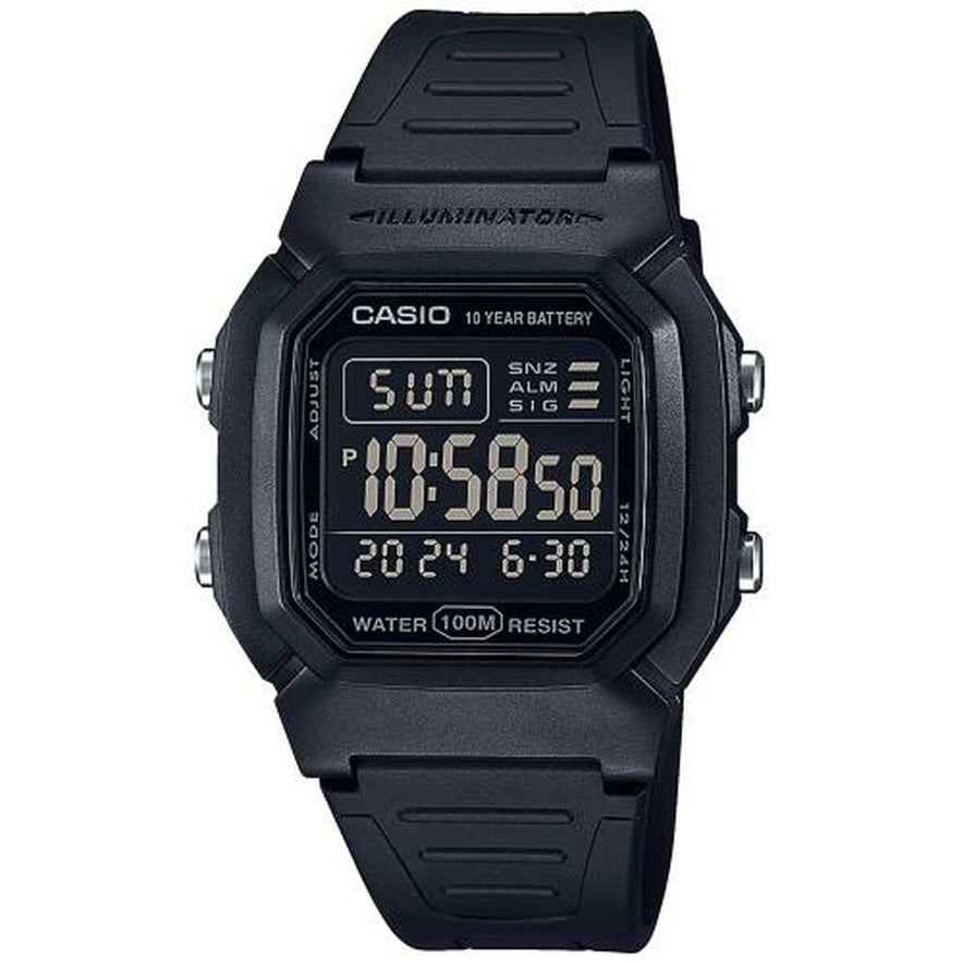 De Casio W-800H-1BVES horloge is een herenhorloge dat functionaliteit en duurzaamheid combineert in een praktisch en klassiek ontwerp. De kast en band van zwarte hars zorgen voor lichtheid en stevigheid, met een ingetogen stijl geschikt voor dagelijks gebruik. Het horloge beschikt over LED-verlichting voor goede afleesbaarheid bij weinig licht, en een chronograaf met een nauwkeurigheid van 1/100 seconde en meetcapaciteit tot 24 uur, ideaal voor sportactiviteiten en tijdsregistratie. Het heeft meerdere instelbare alarmen met snoozefunctie en een uursignaal voor betere dagelijkse organisatie. Dit model bevat een automatische kalender en biedt de keuze tussen een 12- of 24-uursweergave, afgestemd op de voorkeur van de gebruiker. Het acrylglas beschermt de wijzerplaat, terwijl de waterbestendigheid tot 10 bar (100 meter) het mogelijk maakt om zonder zorgen wateractiviteiten te ondernemen. De batterij gaat ongeveer 10 jaar mee, wat het onderhoud beperkt. Daarnaast is er een functie om een tweede tijdzone weer te geven, handig voor reizigers of wie verschillende tijdzones wil bijhouden. Al met al biedt de Casio W-800H-1BVES een goede balans tussen robuustheid, functionaliteit en een ingetogen design, waardoor het een praktische en duurzame keuze is voor wie een veelzijdig horloge zoekt dat aan dagelijkse eisen voldoet.