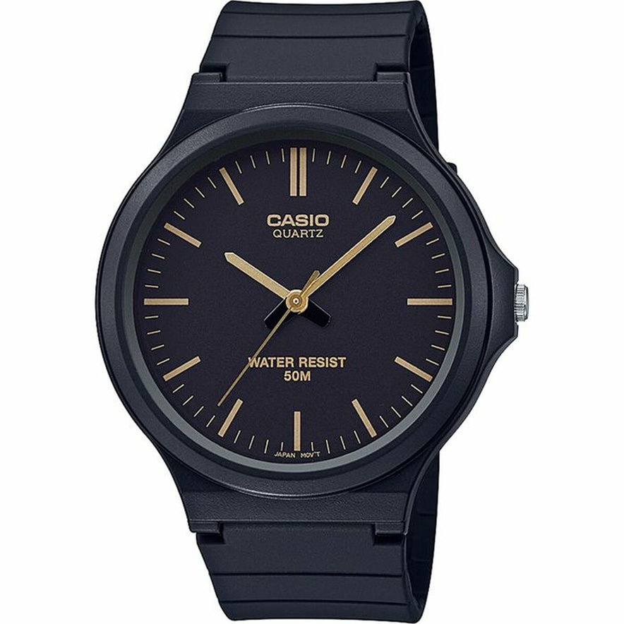 De Casio MW-240-1E2VEF horloge is een herenhorloge ontworpen om functionaliteit en duurzaamheid te bieden in een klassiek en comfortabel formaat. Het heeft een zwarte resin band, een materiaal dat bekend staat om zijn duurzaamheid, lichtheid en slijtvastheid, wat langdurig gebruik garandeert zonder comfort of stijl te verliezen. De zwarte wijzerplaat sluit aan bij de band voor een sober en veelzijdig ontwerp, geschikt voor dagelijks gebruik en diverse situaties. Het beschikt over een gesp als sluiting, die zorgt voor een veilige en persoonlijke pasvorm om de pols. Dit model is bestand tegen waterdruk tot 5 bar, wat effectieve bescherming biedt tegen spatwater en regen, maar niet geschikt is voor langdurig onderdompelen. De kast en afwerking weerspiegelen de robuustheid die kenmerkend is voor Casio, passend bij gebruikers die een betrouwbaar en functioneel horloge zoeken. Het ontwerp is eenvoudig zonder technische of decoratieve franjes, waardoor het een praktische en betaalbare keuze is voor wie waarde hecht aan eenvoud en stevigheid, met de kwaliteitsgarantie van het Japanse merk. Samengevat combineert de Casio MW-240-1E2VEF duurzame materialen met een ingetogen stijl die voldoet aan de basisbehoeften van een modern herenhorloge.