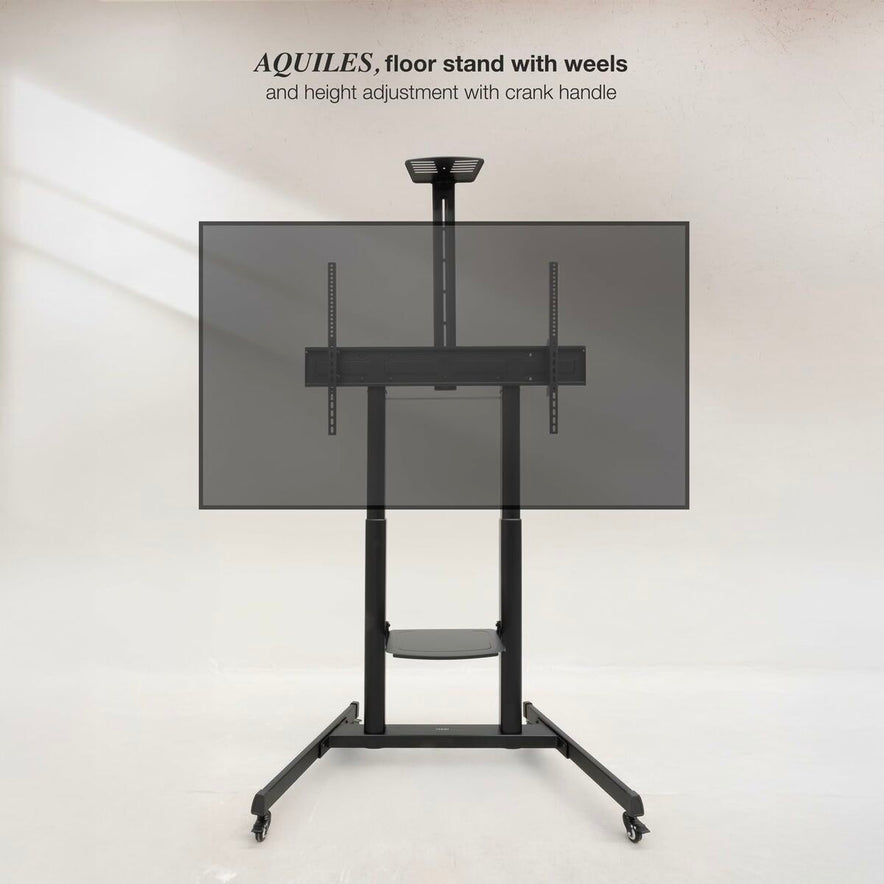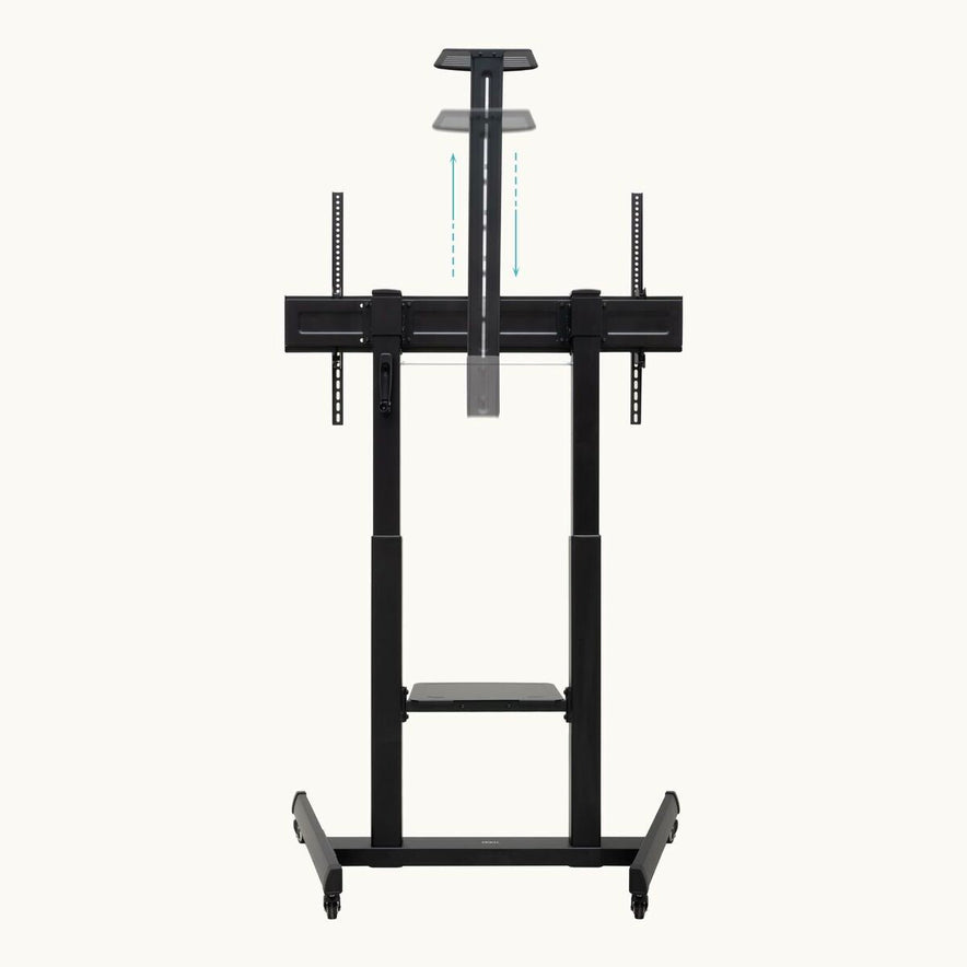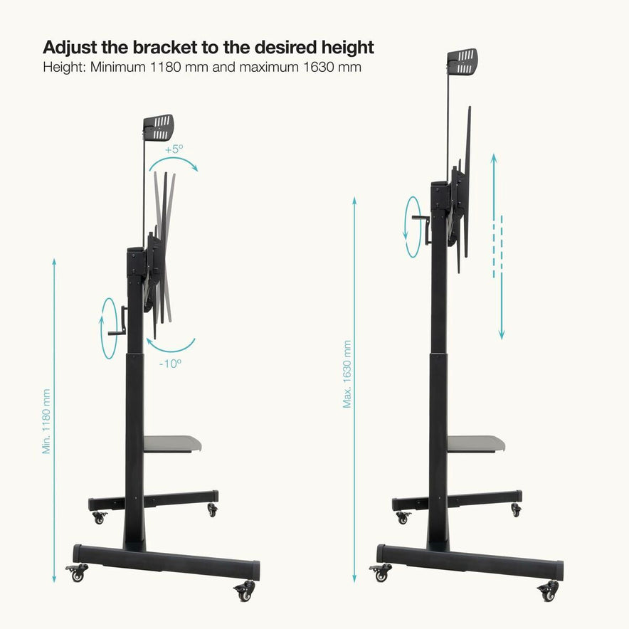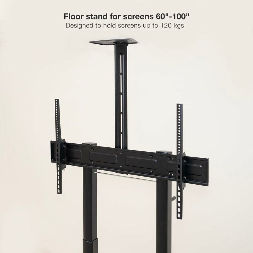 De TooQ FS20406HM-B vloerstandaard is een robuuste en veelzijdige oplossing voor het eenvoudig installeren van grote schermen. Deze standaard is compatibel met schermen van 60" tot 100" en ondersteunt een maximaal gewicht van 120 kg, ideaal voor zowel platte als gebogen monitoren. Gemaakt van hoogwaardig roestvrij staal, biedt het hoge sterkte en duurzaamheid, essentieel voor zware audiovisuele apparatuur. Het ontwerp bevat een telescopische hoogteverstelling met een krukas, met een verstelbereik van 1180 tot 1630 mm, zodat het scherm aangepast kan worden aan verschillende ruimtes en behoeften. Daarnaast is er een verstelbare kantelhoek van +5°/-10° voor een betere kijkhoek. De standaard heeft twee schappen: een onderste van 410x340 mm voor spelers of dvd’s en een bovenste van 285x150 mm voor webcams of accessoires, elk met een draagvermogen van 5 kg en in hoogte verstelbaar tot een maximale totale hoogte van 2303 mm met het bovenste schap. De standaard is uitgerust met wielen met een remsysteem voor mobiliteit en stabiliteit, met een wielafstand van 1177x740 mm, wat zorgt voor een veilige en aanpasbare positie in professionele of thuisomgevingen. Bovendien is er VESA-compatibiliteit van 200x200 tot 1000x600 mm, geschikt voor diverse schermconfiguraties en modellen. De set bevat een complete montageset met gereedschap en een handleiding voor een eenvoudige en veilige installatie. Samengevat combineert de TooQ FS20406HM-B functionaliteit, stevigheid en veelzijdigheid, geschikt voor wie een stabiele en verstelbare standaard zoekt voor grote schermen in zakelijke, educatieve of audiovisuele omgevingen.