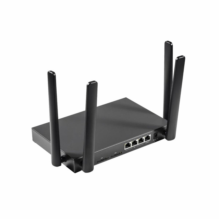 Voor mobiele verbindingen heeft hij twee sleuven voor standaard SIM-kaarten, ondersteunt LTE-FDD en LTE-TDD netwerken op diverse banden, evenals 3G en 2G technologieën, met maximale downloadsnelheden tot 150 Mbps (LTE-FDD). Dit maakt het mogelijk om de router te gebruiken met mobiele netwerken als primaire of back-upverbinding, ideaal voor situaties zonder vaste internetverbinding of als oplossing voor veilige mobiele internetnetwerken. De geavanceerde software ondersteunt essentiële functies voor netwerkbeheer en beveiliging, zoals port forwarding, netwerkdiagnose en VPN-client compatibel met L2TP en PPTP, plus gecontroleerde toegang via witte en zwarte lijsten en opties voor DNS- en APN-aanpassing. Wi-Fi-beveiliging wordt gegarandeerd door WPA2-AES encryptie en gastnetwerken met isolatie en verborgen SSID. Ook bevat hij LED-indicatoren voor systeemstatus, signaalsterkte en SIM-kaart aanwezigheid, plus een fysieke resetknop en aan/uit-bediening.