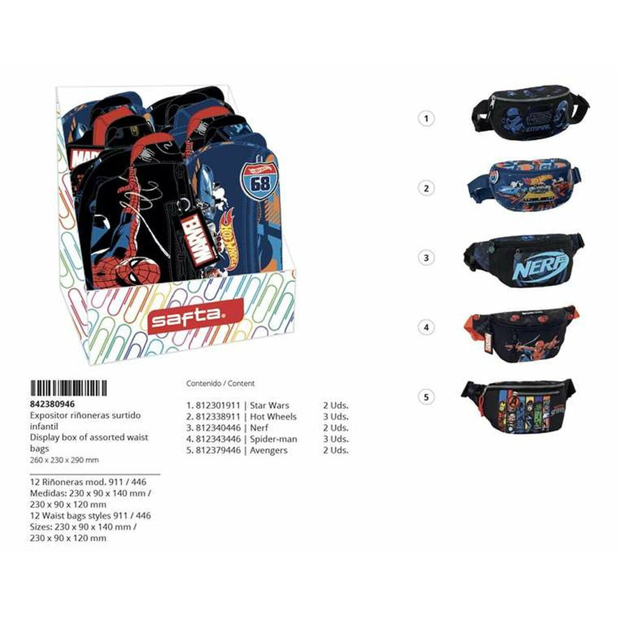 De kinderheuptas van het merk Safta is een praktisch en functioneel accessoire, speciaal ontworpen voor de allerkleinsten, met een uniseks ontwerp dat geschikt is voor zowel jongens als meisjes. Het heeft een multicolor design dat variatie en dynamiek toevoegt, ideaal om te combineren met verschillende kinderstijlen en voorkeuren, en wordt geleverd in diverse ontwerpen die willekeurig worden verzonden afhankelijk van de voorraad, wat een verrassend en exclusief element aan elk stuk toevoegt. Gemaakt voor comfort en gebruiksgemak, met een afmeting van ongeveer 26 x 29 x 23 cm, een geschikt formaat zodat kinderen hun essentiële persoonlijke spullen kunnen meenemen zonder dat het te groot of zwaar is. De samenstelling en vervaardiging garanderen een licht en stevig product, dat makkelijk verstelbaar en draagbaar is tijdens dagelijkse activiteiten, uitstapjes of schoolwandelingen. Deze heuptas is speciaal ontworpen voor kinderen, met functies aangepast aan hun leeftijd, zoals toegankelijke zakken en veilige sluitingen, gecombineerd met een aantrekkelijk en kleurrijk uiterlijk dat het interesse en de zelfstandigheid van kinderen stimuleert om hun spullen te organiseren. Het uniseks en veelzijdige ontwerp maakt het een praktische oplossing voor licht transport, die orde en mobiliteit vanaf jonge leeftijd bevordert. Kortom, deze Safta kinderheuptas combineert functionaliteit, formaat en kindgericht design en is een onmisbare aanvulling op hun dagelijkse activiteiten.