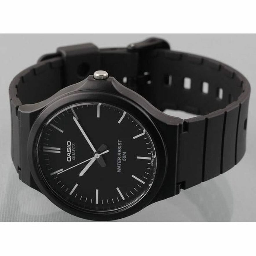 De Casio MW-240-1EVEF is een herenhorloge dat functionaliteit en klassiek design combineert in een praktisch accessoire voor dagelijks gebruik. Het heeft een zwarte resin band, duurzaam en lichtgewicht, die langdurig draagcomfort en een goede pasvorm rond de pols biedt, met een gesp sluiting die zorgt voor een veilige en eenvoudige aanpassing. Het quartz uurwerk garandeert nauwkeurige tijdmeting met weinig onderhoud, een kenmerk van Casio-horloges die betrouwbaarheid hoog in het vaandel hebben. Het ontwerp in zwarte kleur geeft een sobere en veelzijdige stijl die geschikt is voor diverse gelegenheden, van werk tot informele activiteiten. Dit model, onderdeel van de herenlijn van Casio, is bedoeld voor wie een functioneel, duurzaam en klassiek horloge zoekt zonder extra poespas, maar met de garantie van een wereldwijd erkend merk voor kwaliteit en duurzaamheid. Al met al is de MW-240-1EVEF een solide keuze voor gebruikers die zowel eenvoudige esthetiek als de effectiviteit van een quartz uurwerk waarderen in een robuust en comfortabel horloge.
