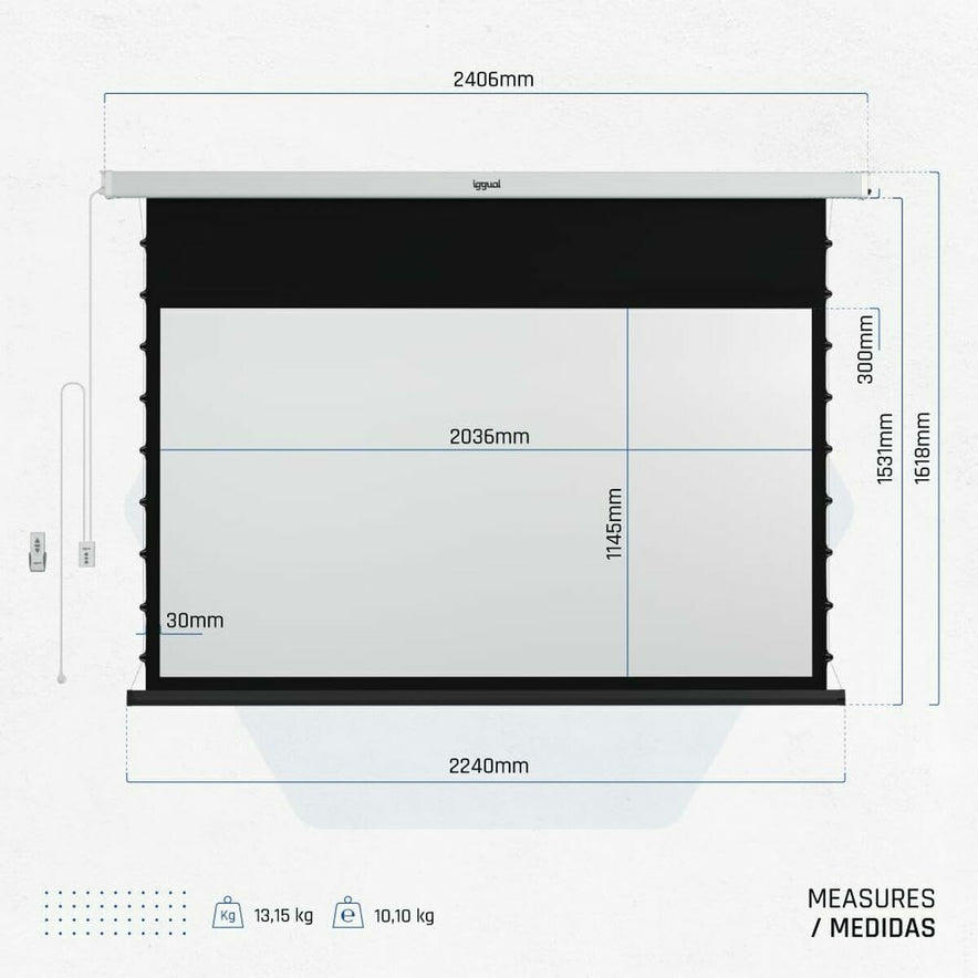 Het Elektrisch Wandprojectiescherm van het merk iggual is een veelzijdige en praktische oplossing voor audiovisuele installaties in professionele of thuisomgevingen. Dit projectiescherm heeft een 16:9 formaat, ideaal voor het bekijken van content in hoge definitie, met totale afmetingen van 203 x 114 cm en een bruikbare diagonaal van 92 inch, perfect voor presentaties, thuisbioscoop of elke vorm van multimedia-projectie. De mat witte behuizing zorgt voor een visuele integratie in elk interieur, met een strak en minimalistisch design. Gemaakt van hoogwaardig doek dat zorgt voor goede contrasten en kleurgetrouwe beelden, wordt dit scherm direct aangesloten op het elektriciteitsnet met een spanning van 230 V, wat een automatische en stille uitrol en oprol garandeert voor meer comfort en duurzaamheid. Daarnaast wordt een afstandsbediening meegeleverd, waarmee het scherm bediend kan worden zonder fysieke aanraking, wat het gebruiksgemak verhoogt en aanpasbaar maakt aan verschillende ruimtes. Het scherm beschikt ook over USB-connectiviteit, wat toekomstige upgrades of integraties met externe systemen mogelijk maakt. Al met al is dit scherm een evenwichtige en functionele keuze voor gebruikers die kwalitatieve projectie in breedbeeldformaat wensen, met eenvoudige bediening en een ontwerp dat zich discreet aanpast aan diverse omgevingen. De combinatie van formaat, aspect ratio en automatisering maakt het een efficiënt hulpmiddel voor professionele audiovisuele presentaties of het genieten van multimedia in privéruimtes.