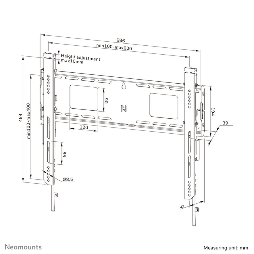 De Neomounts WL30-750BL16 is een vaste muurbeugel voor tv ontworpen voor grote en interactieve schermen, compatibel met schermformaten van 42" tot 86" en een maximale draagcapaciteit van 125 kg. Deze stevige beugel biedt een veilige en nauwkeurige oplossing voor het bevestigen van zware schermen dankzij de hoogprofiel muurplaat die stabiliteit garandeert, zelfs op oneffen oppervlakken. Het ontwerp bevat diepteverstelbare steunen aan de onderzijde om het gewicht optimaal te verdelen en maximale stevigheid te waarborgen. Daarnaast heeft het individueel in hoogte verstelbare armen tot 10 mm, waarmee het scherm nauwkeurig waterpas gezet of in de gewenste positie geplaatst kan worden. Het profiel is ultradun, met een afstand tot de muur van slechts 4,2 cm, wat zorgt voor een discrete en elegante afwerking van de installatie. Deze beugel voldoet aan de VESA-standaard van 100x100 tot 600x400 mm, geschikt voor de meeste professionele en grote schermen. Voor kabelbeheer is de beugel voorzien van een slimme schuiffunctie voor eenvoudige toegang tot connectors en poorten, evenals diverse uitsparingen en gaten voor het netjes bevestigen en organiseren van kabels en apparaten, wat bijdraagt aan een professionele en opgeruimde installatie. Het snelle montagesysteem met aansluitplaat maakt zowel installatie als veilige verwijdering van het scherm eenvoudig, met een vergrendel- en loslaatmechanisme dat gebruiksgemak en veiligheid biedt. Voor extra beveiliging kan een hangslot (niet inbegrepen) worden bevestigd om ongeautoriseerde manipulatie te voorkomen. Optioneel kan een zijsteun voor AV-apparatuur worden toegevoegd voor opslag of bevestiging van aanvullende apparaten. De Neomounts WL30-750BL16 LEVEL combineert geavanceerde functionaliteit, hoge draagkracht en een doordacht ontwerp voor een stabiele, veilige en professionele touchscreen-ervaring, ideaal voor omgevingen waar betrouwbaarheid en precisie bij het installeren van grote en zware schermen vereist zijn.