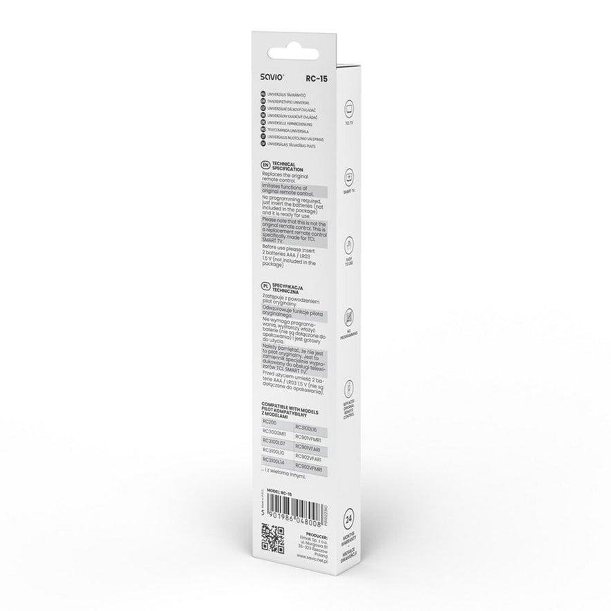 De universele afstandsbediening RC-15 van het merk Savio is een apparaat dat is ontworpen voor comfortabel en veelzijdig gebruik van een breed scala aan elektronische apparaten, vooral televisies en multimedia-apparaten. Het heeft een praktisch ontwerp in zwarte kleur met multicolor details die het intuïtief herkennen van functies vergemakkelijken, wat de gebruikerservaring bij dagelijks gebruik verbetert. Het kenmerkt zich door universele compatibiliteit, waardoor het mogelijk is meerdere merken en modellen te bedienen zonder verschillende afstandsbedieningen te gebruiken, wat het beheer van audiovisuele systemen thuis vereenvoudigt. Het ergonomische formaat zorgt voor een snelle en comfortabele bediening, zelfs tijdens langere sessies, en de configuratie is eenvoudig, geschikt voor zowel ervaren gebruikers als beginners. Dit model valt op door zijn basis- en effectieve functionaliteit, met directe toegang tot essentiële commando’s zonder onnodige functies die het gebruik bemoeilijken. De stevigheid en kwaliteit van de materialen garanderen duurzaamheid en weerstand tegen dagelijks gebruik. De RC-15 is een praktische oplossing voor wie een betrouwbare vervanging of een functionele universele afstandsbediening zoekt die past bij de meeste televisies en compatibele apparaten op de markt. Samengevat combineert de universele afstandsbediening Savio RC-15 eenvoud, veelzijdigheid en functioneel ontwerp voor gemakkelijk dagelijks gebruik.